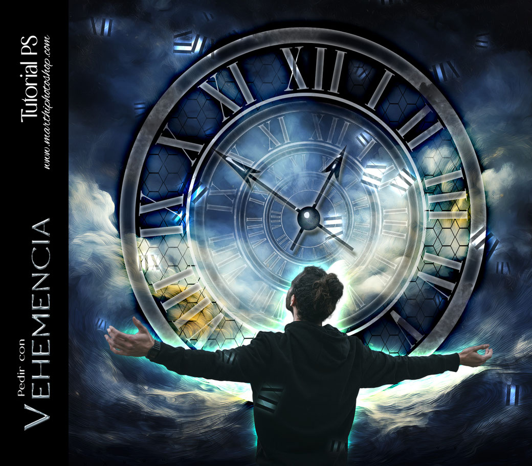 Con los materiales tenemos de todo, dos cielos para el fondo, la imagen de nuestro modelo, una tipografia para crear el reloj,